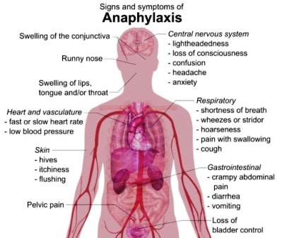 Anaphylaxis can happen just seconds after being exposed to a triggering substance or can be delayed for up to 2 hours if the reaction is from a food. It can involve various areas of the body.