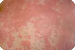 A harmless rash, pityriasis rosea usually begins with a single, scaly pink patch with a raised border. Days to weeks later, salmon-colored ovals appear on the arms, legs, back, chest, and abdomen, and sometimes the neck. Patches on the back may appear "Christmas tree" shaped. The rash, whose cause is unknown, usually doesn't itch, and often goes away in 6-8 weeks without treatment.
