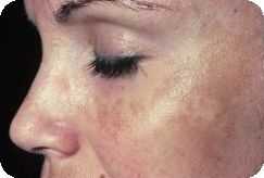Melasma (or chloasma) is characterized by tan or brown patches on the cheeks, nose, forehead, and chin. Although usually called the "pregnancy mask," men can also develop it. Melasma may go away after pregnancy but, if it persists, can be treated with prescription creams and over-the-counter products. Use a sunscreen at all times if you have melasma, as sunlight worsens the condition.