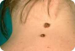 Usually brown or black, moles can be anywhere on the body, alone or in groups, and generally appear before age 20. Some moles (not all) change slowly over the years, becoming raised, developing hair, and/or changing color. While most are non-cancerous, some moles have a higher risk of becoming cancerous. Have a dermatologist evaluate moles that change, have irregular borders, unusual or uneven color, bleed, or itch.