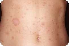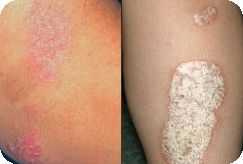 A non-contagious rash of thick red plaques covered with silvery scales, psoriasis usually affects the scalp, elbows, knees, and lower back. The rash can heal and recur throughout life. The cause of psoriasis is unknown, but skin inflammation may be triggering new skin cells to develop too quickly.