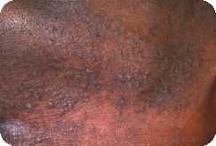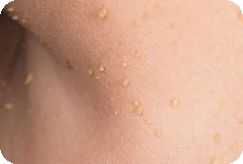 Noncancerous growths that may develop with age, seborrheic keratoses can appear on the chest or back, alone, or in groups. They may be dark or multicolored, and usually have a grainy surface that easily crumbles, though they can be smooth and waxy. No treatment is necessary unless irritation develops or their appearance is a concern. Because seborrheic keratoses may be mistaken for moles or skin cancer, see a specialist for proper diagnosis.