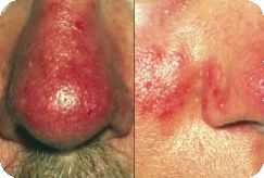 Often beginning as a tendency to flush easily, rosacea causes redness on the nose, chin, cheeks, forehead, even in the eyes. The redness may intensify over time, taking on a ruddy appearance. If left untreated, bumps and pus-filled pimples can develop, with the nose and oil glands becoming bulbous.
