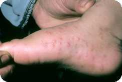 The result of blocked sweat ducts, heat rash looks like small red or pink pimples. Appearing over an infant's head, neck, and shoulders, the rash is often caused when well-meaning parents dress baby too warmly, but it can happen to any infant in very hot weather. A baby should be dressed as lightly as an adult who is resting; though their feet and hands may feel cool to the touch, this is usually not a problem.