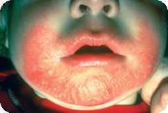 This condition (also called atopic eczema or infantile eczema) affects people with dry and rough skin (keratosis pilaris) and may be caused by a variety of allergens. It often starts in early childhood, around three months of age, and tends to run in 'atopic' families.