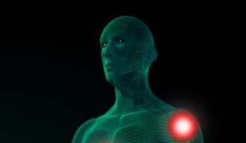 The pain of arthritis in the acromioclavicular joint is focused on the front of the shoulder. Someone with rheumatoid arthritis may have pain in all these areas if both shoulder joints are affected.